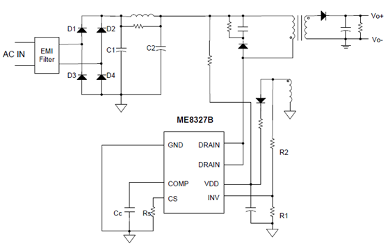 產品描述:ME8327B 是一款滿足六級能效標準原邊反饋準諧振