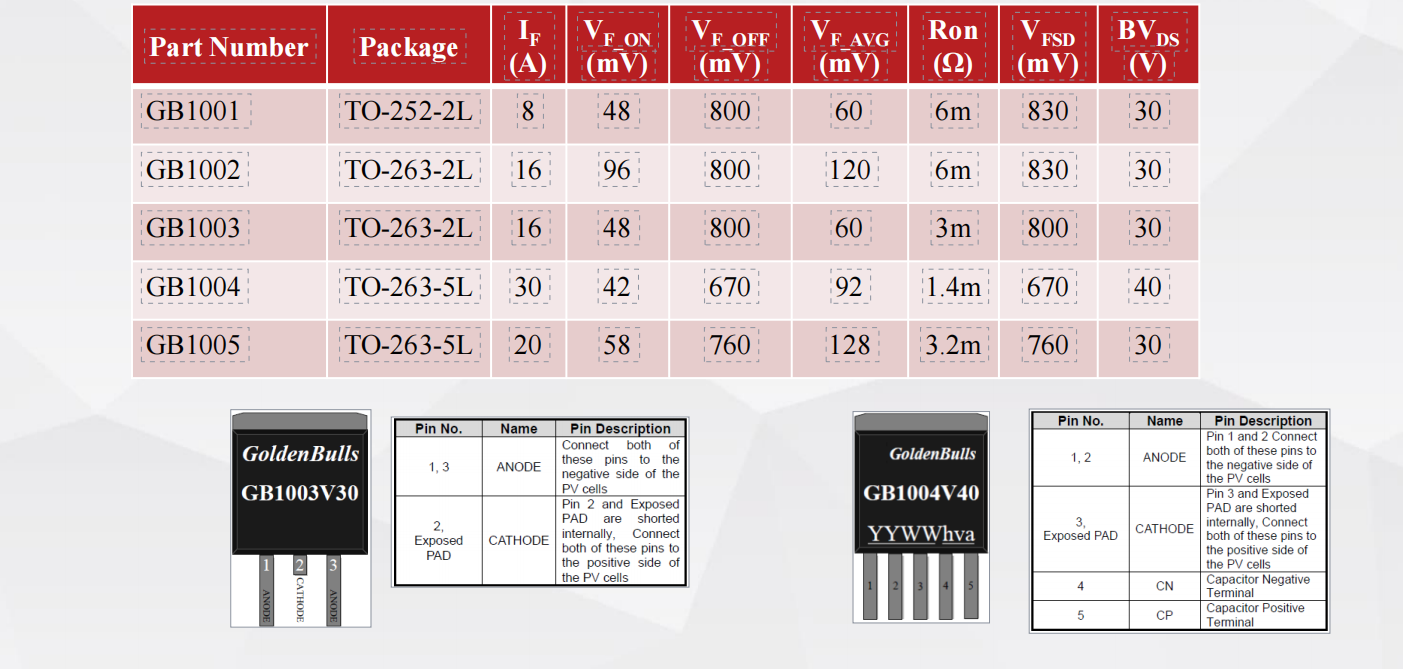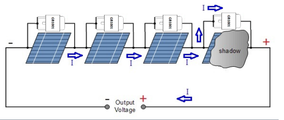 UltraBypassTMGB1001是用于光伏應用的開關,當太陽能面板的某些部分在正常操作過程中被遮蔽或損毀時,它的目的是為太陽能板串電流提供一條備用路徑,如果沒有旁路二極管,則陰影單元將顯示出熱點,這是由反向偏置單元中的過多功耗造成的。