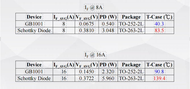 GB1001的優點是其順向電壓比肖特基二極管低,在電流為8A時,典型的平均正向壓降為67.5mV。