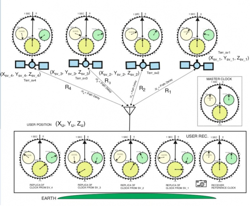 - 計算GPS接收機(GNSS模組)的三維位置 , 要求GPS接收機至少接收來自4顆衛星的信號 , 根據空間三角形勾股定理和四元一次方程計算得到三維位置.