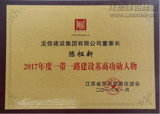 1月19日,由江蘇省蘇商發展促進會主辦的“2018年(第12屆)蘇商領袖年會暨2017年蘇商人物系列推選頒獎典禮”在南京隆重舉行。龍信集團董事長陳祖新榮獲“2017年度一帶一路建設蘇商功勛人物”稱號。