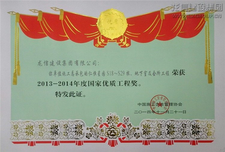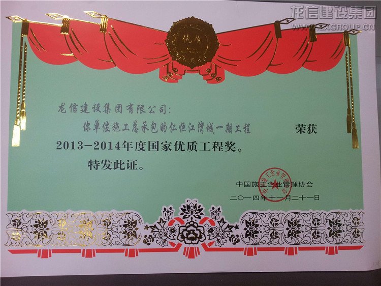 近日公司承建的“仁恒星園S18~S29棟、地下室及會所”、“仁恒江灣城一期工程”喜獲2013-2014年度“國家優(yōu)質(zhì)工程獎”,子公司江蘇紫浪裝飾裝璜有限公司承建的海門市東恒盛國際大酒店裝飾工程獲“2013-2014年度全國建筑工程裝飾獎”。