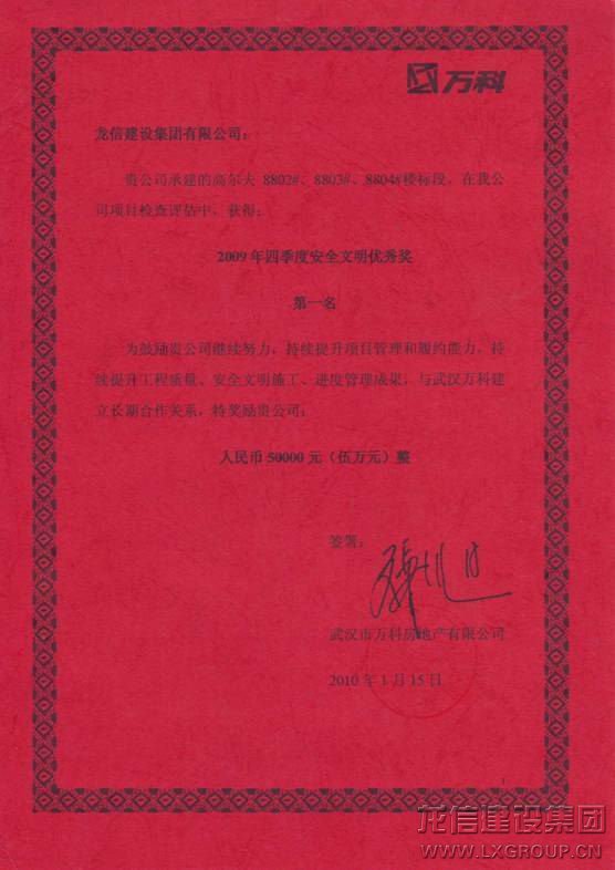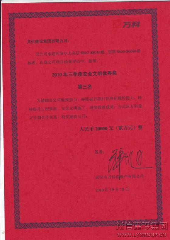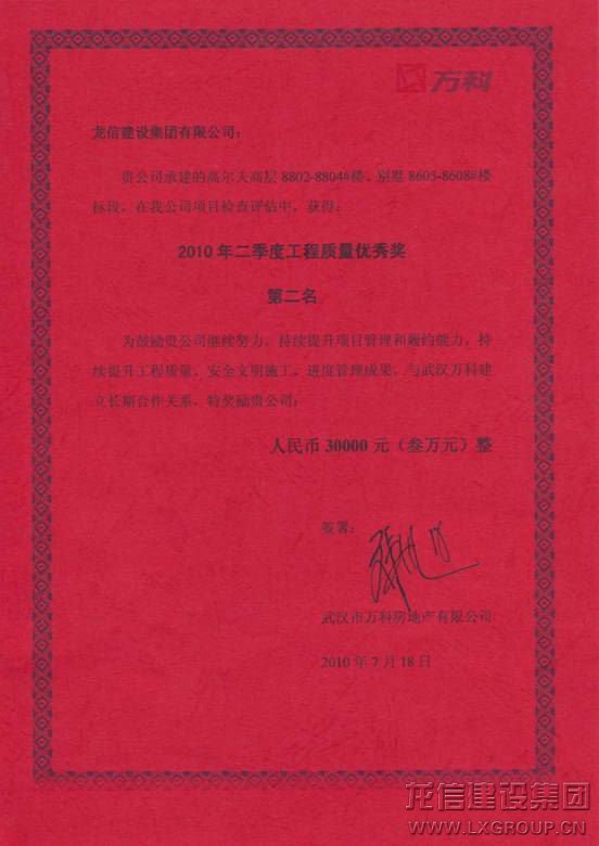 武漢高爾夫城市花園項目在2010年萬科所有項目的季度評選中所取得的優越成績